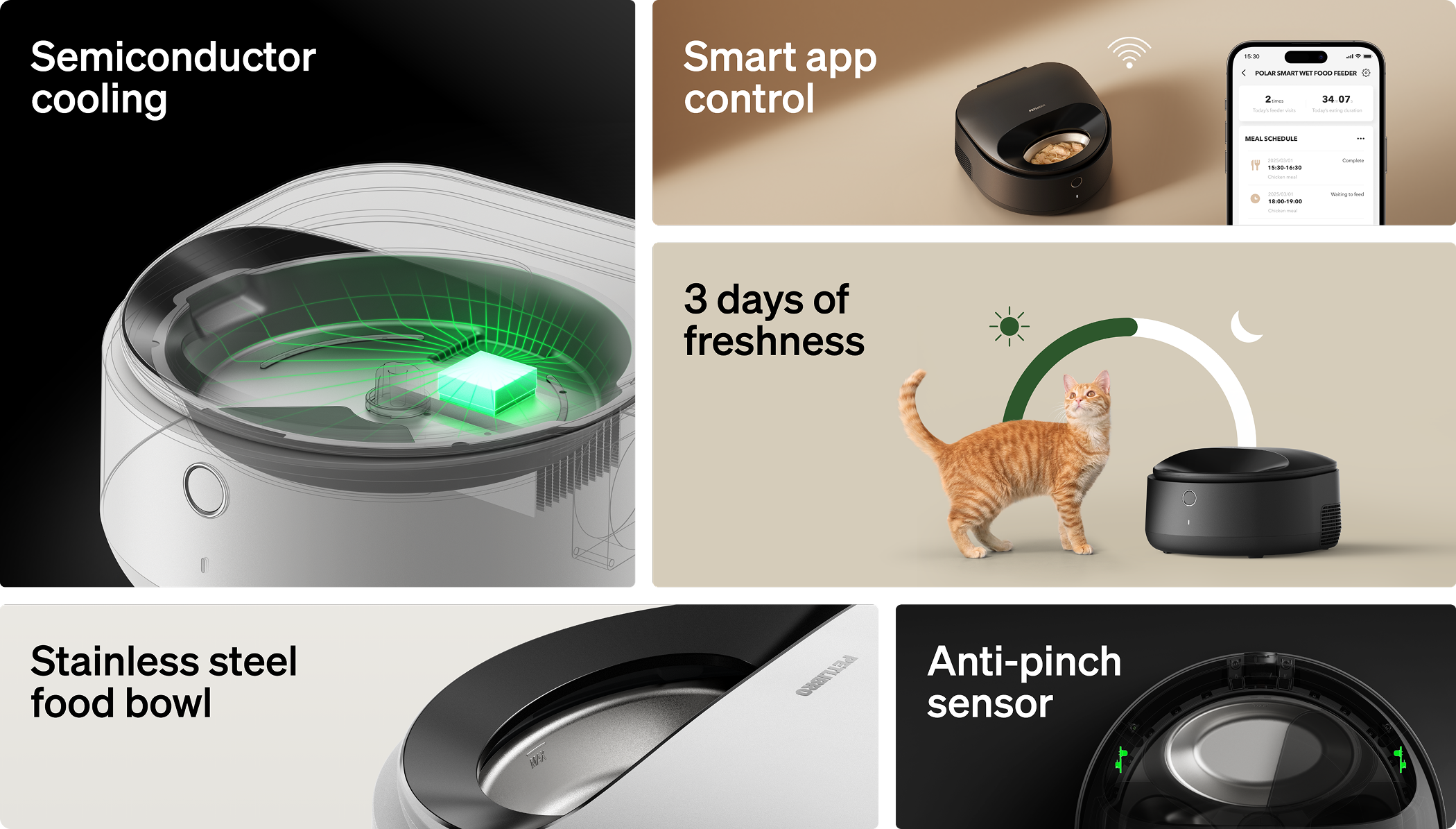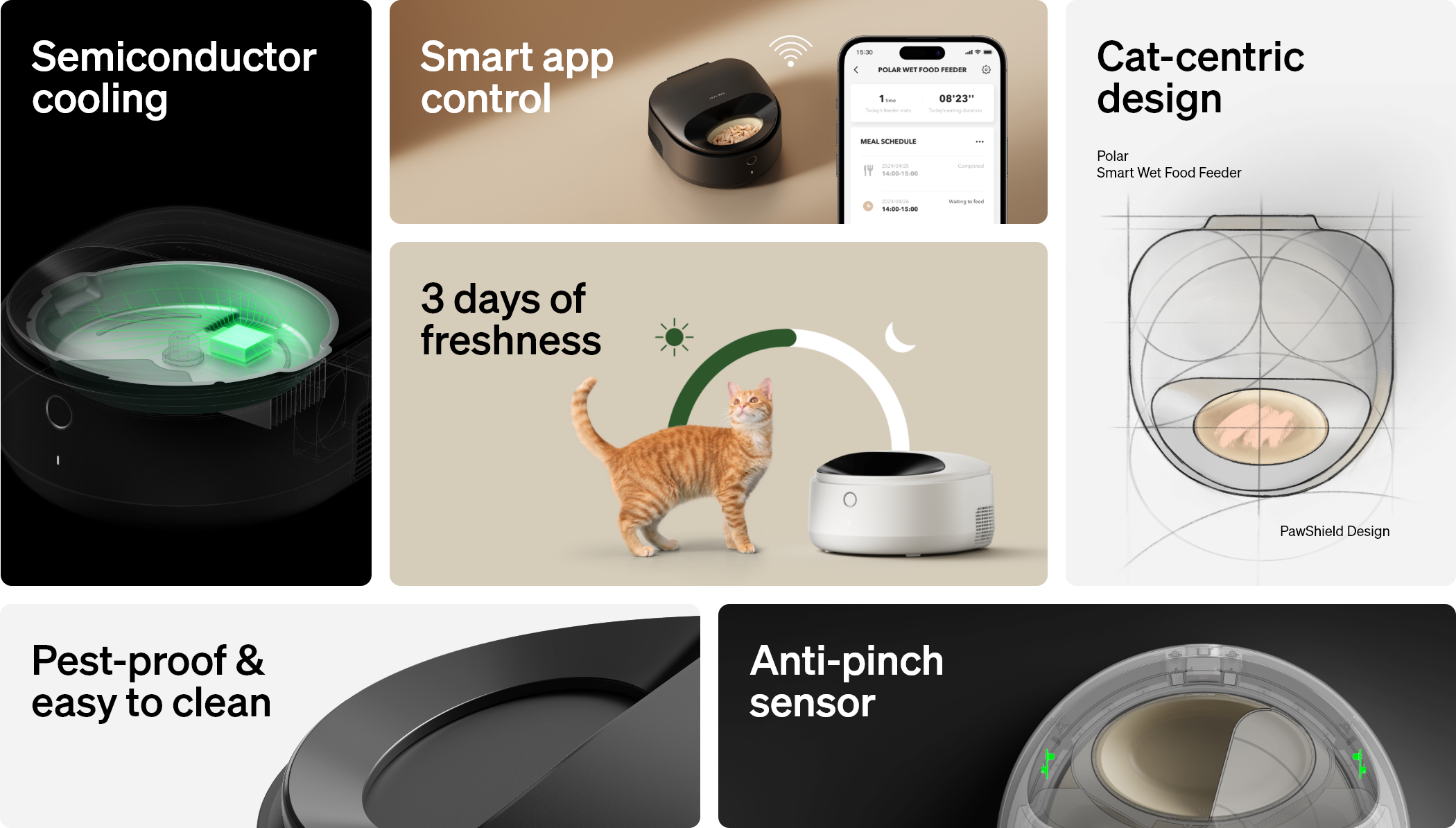 Polar's anti-pinch lid sensor makes sure the lid stays open as long as your pet is enjoying their meal or hanging around, and if they get too close while it’s closing, it’ll instantly stop and pull back.