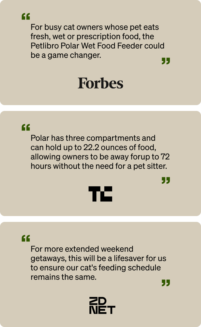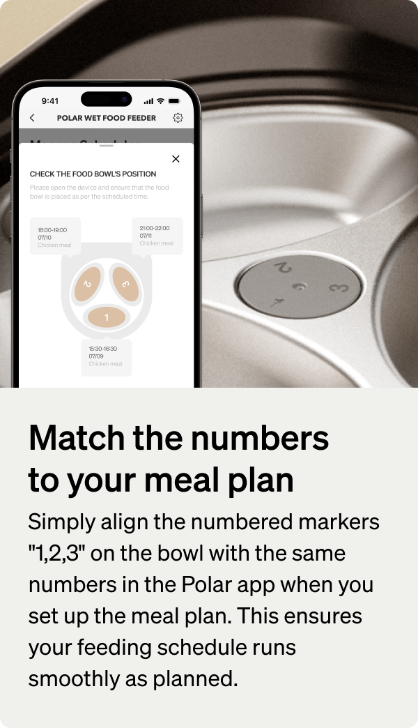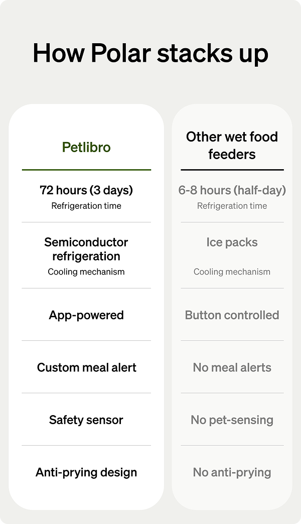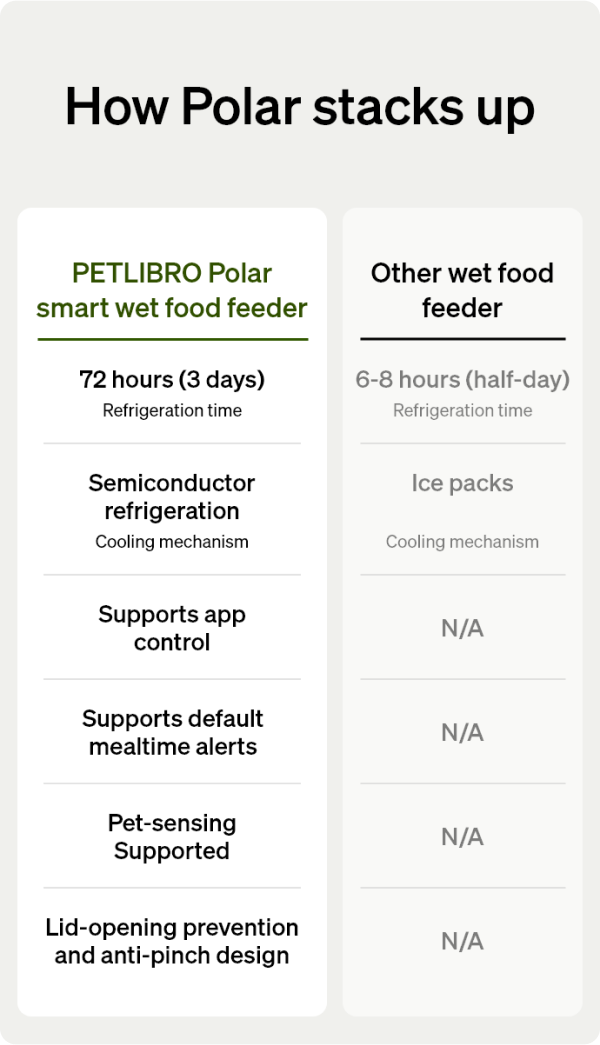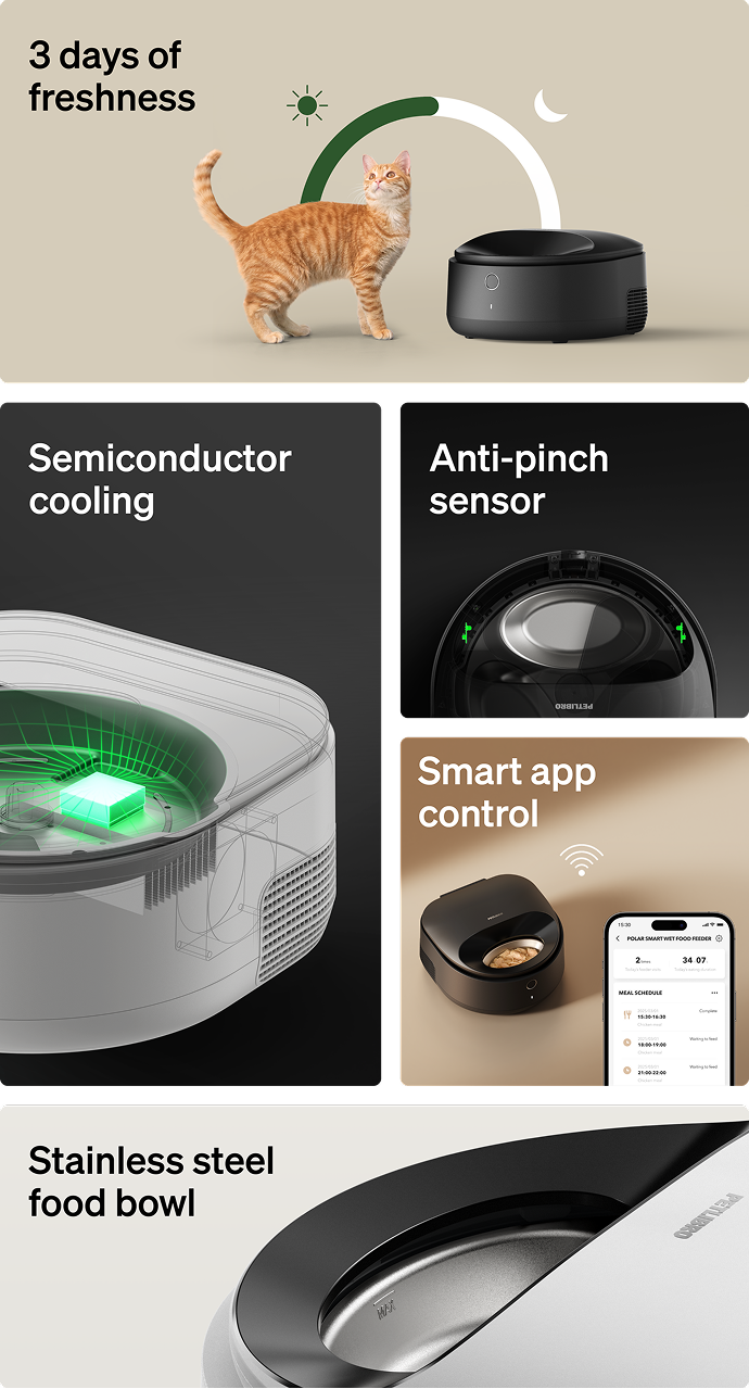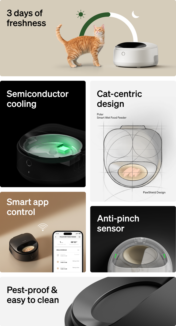 A: Polar’s thoughtful design ensures your pet enjoys fresh, gently chilled food. The feeding bowl rotates to the feeding area 30 minutes before mealtime, allowing food to naturally warm to a milder temperature. Additionally, the built-in temperature sensor halts cooling to ensure a perfect serving experience.