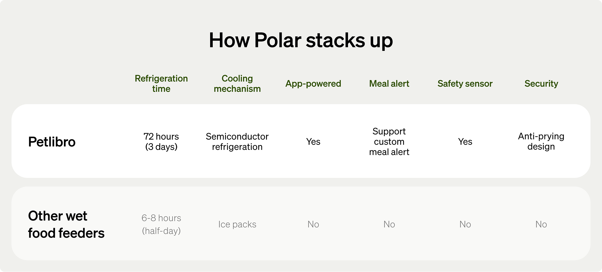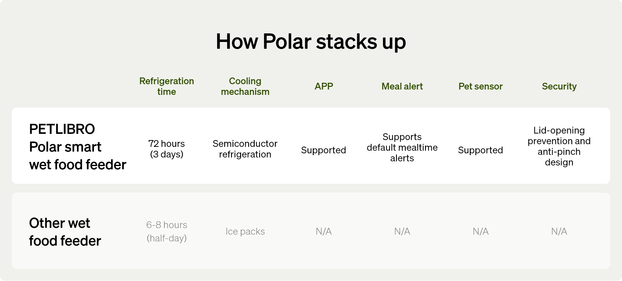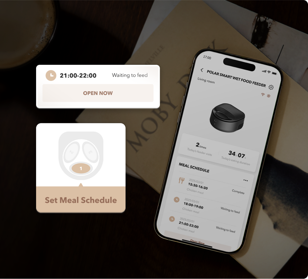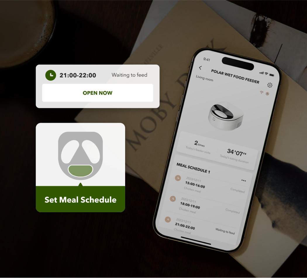A: Polar’s thoughtful design ensures your pet enjoys fresh, gently chilled food. The feeding bowl rotates to the feeding area 30 minutes before mealtime, allowing food to naturally warm to a milder temperature. Additionally, the built-in temperature sensor halts cooling to ensure a perfect serving experience.