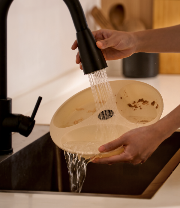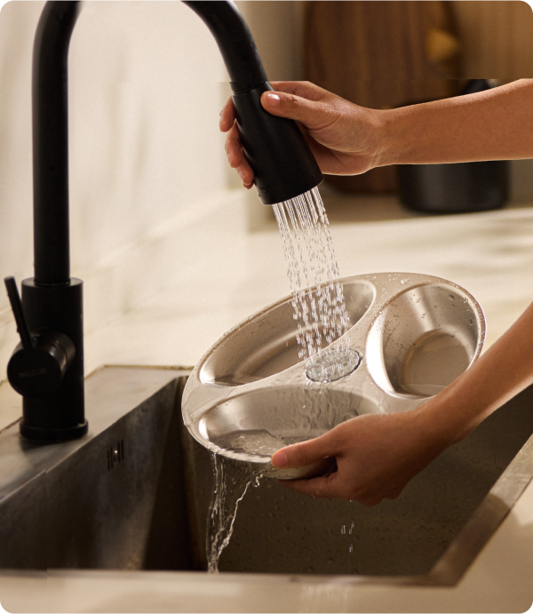 A: The feeding bowl is dishwasher-safe (up to 153°F (67°C)) or can be hand-washed with water for easy upkeep.